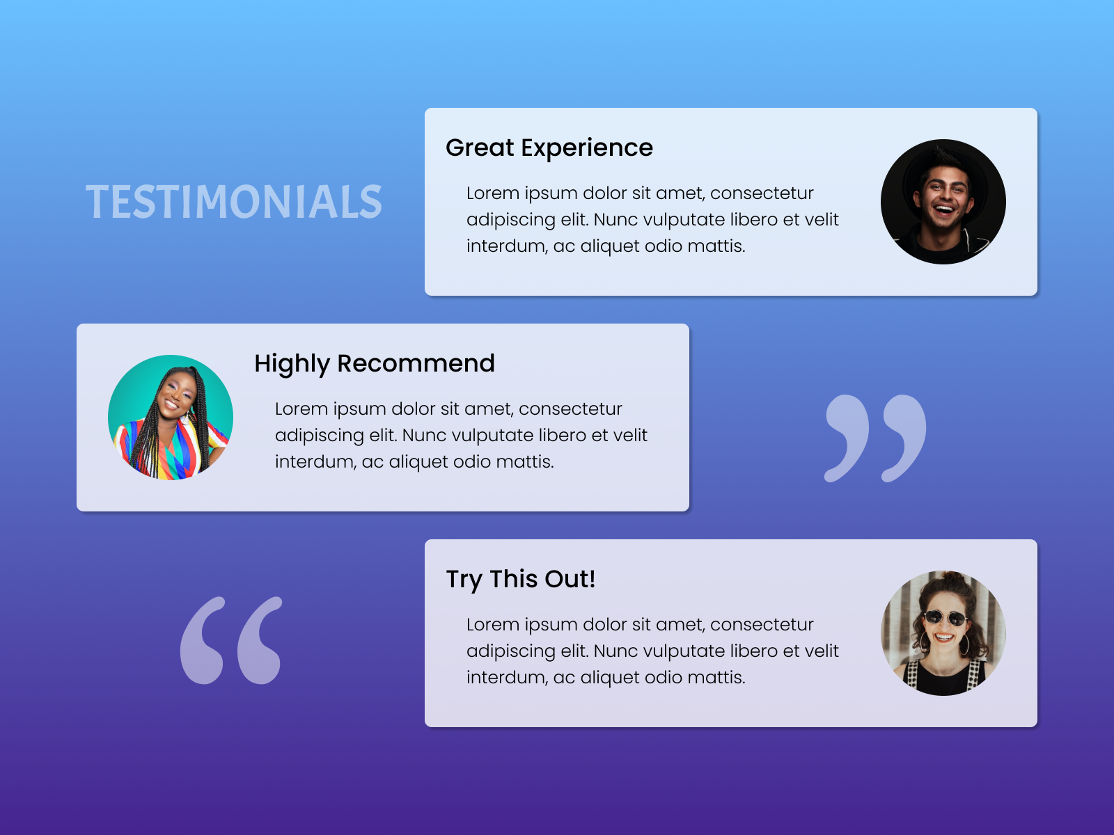 This challenge is a perfect opportunity for me to display type hierarchies and object layout principles. I've said this before, but simplicity works and testimonials don't need to be over complicated.